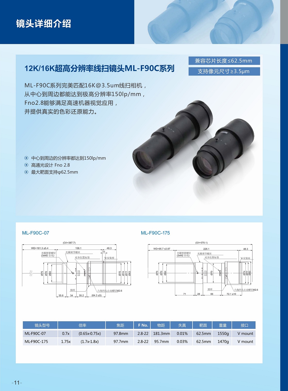 ML-F90C系列完美匹配16K@3.5um線掃相機,從中心到周邊都能達到極高分辨率150lp/mm,Fno2.8能夠滿足高速機器視覺應用,并提供真實的色彩還原能力。