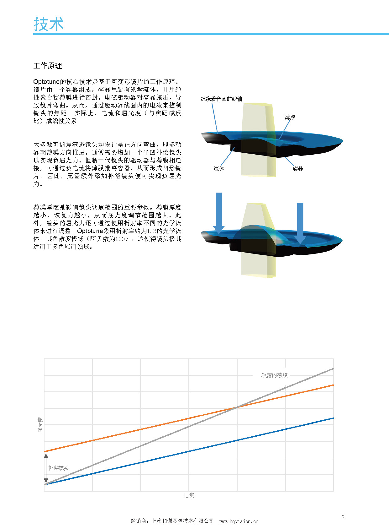 Optotune的核心技術是基于可變形鏡片的工作原理。鏡片由一個容器組成,容器里裝有光學流體,并用彈性聚合物薄膜進行密封。電磁驅動器對容器施壓,導致鏡片彎曲。從而,通過驅動器線圈內的電流來控制鏡頭的焦距。實際上,電流和屈光度(與焦距成反比)成線性關系。